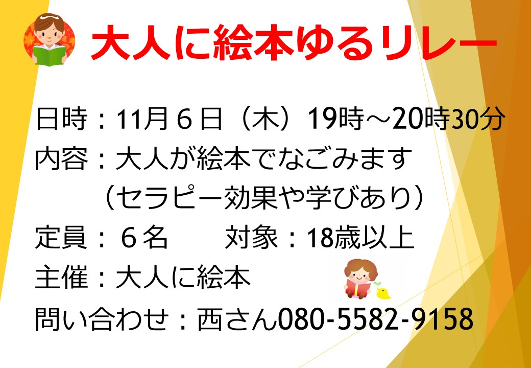 内容:大人が絵本でなごみます。